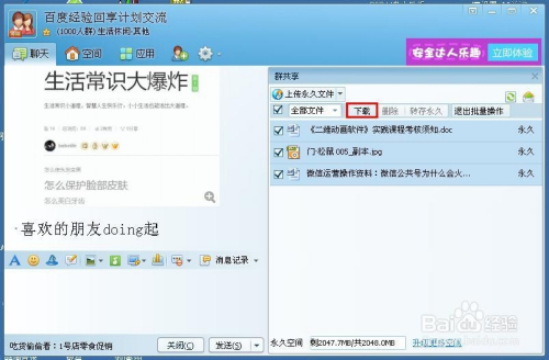 在群里共享文件办法如下1打开自己的主界面,选择群组按钮,在下列表中选中一个群并双击2弹出群聊天对话框,单击群共享按你按钮3在弹出的群共享面板中单击上传按钮4选择上传永久文件选项卡,单击添加文件按钮5弹出打开对话框,选择需要上传的;首先,你需要打开自己所在的群找到文件模块在群的聊天界面右侧,有一个应用软件区域,点击并找到文件模块,单击进入浏览群共享文件进入文件模块后,你将看到群内成员共享的所有文件你可以通过点击文件名称或后面的放大镜按钮来查看文件的详细信息,确认文件是否为自己所需二下载群共享。